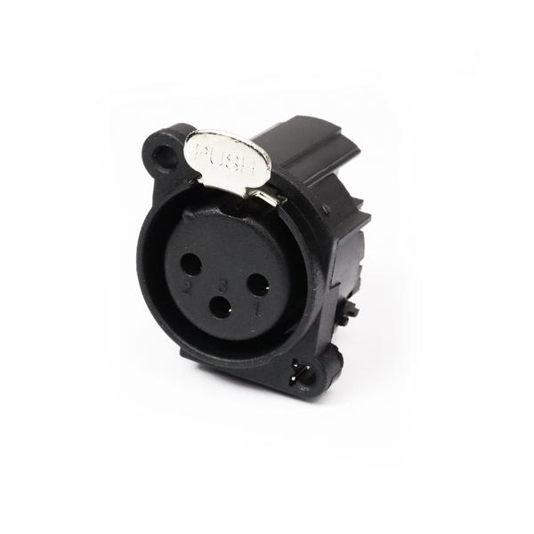 3-контактный терминал XLR типа «мама». Черный пластиковый корпус, позолоченные контакты, механизм для фиксации, вертикальная установка на печатную плату.